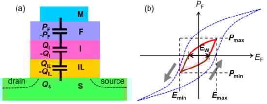 Regarding a ferroelectric hidden in MFI(IL)S, an exact symmetric swing maximum, i.e., Pmax = |Pmin| or Emax = |Emin|, is difficult because |QS| versus ΦS is very asymmetric [61,62]. The QS is the charge area density of the semiconductor surface and ΦS is the surface potential. Presence of the flat-band voltage Vfb makes the symmetric swing further difficult. However, to simplify the physical explanation, Pmax = |Pmin| and Emax = |Emin| are assumed as shown in Figure 2b with Vfb = 0V. In every PF-EF loop, the EF width at PF = 0 is defined as Ew being related with a voltage memory window (Vw) by an approximate expression Ew = 2Ec = Vw/dF, where the Ec is a coercive field and dF is ferroelectric thickness. According to a method we proposed before [43], an important characteristic Emax of the ferroelectric can be evaluated which has not been measurable by direct probing on a FeFET. If Pmax is provided, a gate voltage Vg to achieve a target memory window Vw = Ew·dF can be estimated as a sum of Emax·dF, EI·dI, EIL·dIL and ΦS at QS = Pmax. An exact discussion can be found in the paper [43].