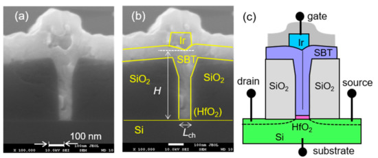 A cross-sectional scanning-electron-microscope photograph of an Ir/SBT/HfO2/Si FeFET fabricated by the new proposed process is shown in Figure 3a. Figure 3b shows the same picture added with support lines to clarify the material boundaries. The schematic drawing of the FeFET was assigned with four terminals of gate, drain, source and substrate (Figure 3c). The gate-channel length (Lch) was Lch = 85 nm. The gate-channel width was W = 100 μm depending on the initial LOCOS pattern designed in Step 1 in Section 2.1. The metal-gate length Lm was 150 nm which could be shorter but was not the focus in this work. The SBT precursor film thickness was about 80 nm measured on a flat place. By filling gate grooves with SBT precursor (Step 8 in Section 2.1.), the effective SBT height (H) was finally about 450 nm which was a distance between Ir and HfO2. Area scalability of the new FeFET was equivalent to that of the dummy gates which are organic resist patterns made by lithography. From the viewpoint of Si transistor technology, Lch = 10 nm is expected to be the critical limit [71]. A significant Curie-temperature decrease in SBT started when particle were sizes of around 20 nm [25]. Thus, the prospective shortest limit of Lch by our proposed FeFET process may be around 20 nm.