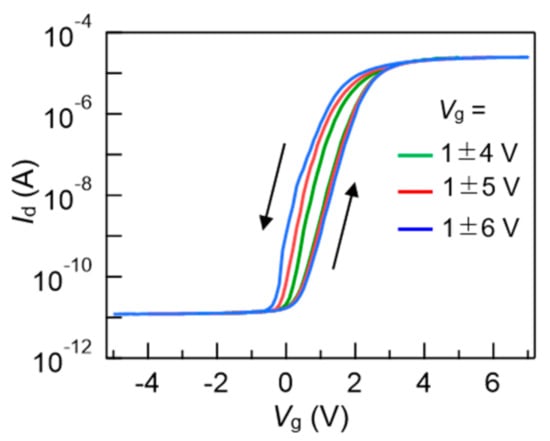 As an elementary test of the FeFETs, Id–Vg hysteresis loops were investigated (Figure 4). The Id was measured by Vg increments and decrements with 0.1 V steps. The Vg sweeping ranges were Vg = 1 ± 4 V, 1 ± 5 V and 1 ± 6 V. Drain voltage (Vd), source voltage (Vs) and substrate voltage (Vsub) were fixed to Vd = 0.1 V and Vs = Vsub = 0 V during the measurements. The Id–Vg showed hysteresis loops drawn in counter-clockwise directions because the FeFET was an n-channel-type one. In an Id–Vg curve, threshold voltage (Vth) was defined as a Vg value at Id/W = 1 × 10−7 A/cm. Two Vth values were extracted from the left- and right-side curves in an Id–Vg hysteresis loop. A memory window was defined as the Vth difference. In this work, we call this a static memory window (Vw) because Vg sweep by 4156C is slow. The static Vw was, for instance, 1.0 V by sweeping Vg from −5 to 7 V then back to −5 V, or at Vg = 1 ± 6 V as expressed in Figure 4. During the measurement of a wide-range Id from 10−12 to 10−4 A as indicated in Figure 4, Vg sweep speed depends on the current range. Therefore, an Id–Vg hysteresis curve only gives reference information that is not suitable for accurate discussion.