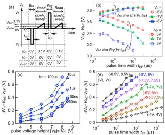 Investigation of VthE and VthP by applying Vg pulses to a FeFET with Lch = 85 nm. The channel width was W = 100 μm. (a) The measurement procedure; (b) measured original VthE and VthP; (c) pulse-height dependence of ΔVth = VthE − VthP and (d) pulse width dependence of ΔVth.