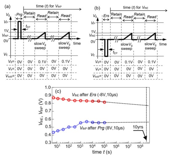 Retention of a FeFET was measured by the procedures as shown in Figure 6a,b. After program (Prg), Retain and Read were repeated during the scheduled time. In Prg, a Vg pulse of (VP, tEP) was applied with Vd = Vs = Vsub = 0 V. In Retain, all the terminals were kept at zero as Vg = Vd = Vs = Vsub = 0 V. In Read at a certain time t, an Id–Vg curve was drawn by varying Vg in a narrow range from 0 to 1.0 V at Vd = 0.1 V and Vs = Vsub = 0 V. A VthP was extracted from the Id–Vg and plotted with a marker at t as shown in Figure 6c. After completing the VthP-t, VthE-t started to be measured. In erase (Ers), a Vg pulse of (VE, tEP) was applied with Vd = Vs = Vsub = 0 V. After Ers, Retain and Read were repeated during the scheduled time. The Retain and Read conditions for VthE-t were the same as those for VthP-t. In the Read at a certain time t, an extracted VthE was plotted with a marker at t as shown in Figure 6c. In this work, VP = 8 V, VE = −8 V and tEP = 10 μs. The retention was measured for 105 s in each of VthP–t and VthE–t. At t = 105 s, they were still distinguishable with a difference ΔVth = 0.26 V. When t > 103 s, as shown in Figure 6c, the gradient of the VthP-log(t) and VthE–log(t) curves appeared to be nearly zero. A possible ten-year retention was suggested by extrapolation lines drawn on the last three markers in each branch. The present Lch = 85 nm FeFET showed a good retention to the same extent as those of the conventional (C)SBT FeFETs [1,2,3,4,5,6,7,8,9,11,12,37,38,39,40,42,45,46,52].