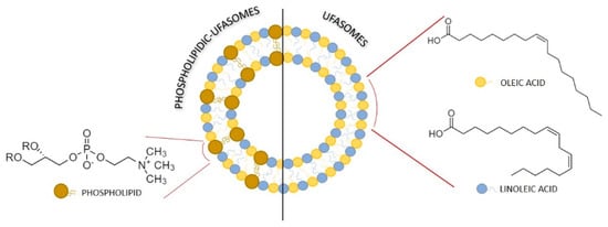 Ufasomes was proposed for the first time in 1973 by Gebicki and Hicks [21] as “unsaturated fatty acid vesicles” characterized by a closed lipid bilayer membrane, and they are included in the category of fatty acid vesicles, made up of fatty acid and their ionized species [22,23]. Although to date the literature concerning ufasomes is scarce, some research groups have prepared fatty acid vesicles using different saturated, unsaturated and highly unsaturated fatty acid, such as octanoic acid [24] oleic acid, linoleic acid, and docosahexaenoic acid [25]. The main components of ufasomes are normally oleic acid (cis-9-octadecenoic acid) and linoleic acid (cis, is-9,12-octadecadienoic acid), that are unsaturated fatty acids and their use leads to many advantages. In particular, compared with their better-known precursor liposomes, the ufasomes present a dynamic nature due to the presence of single-chain amphiphiles in their composition, which makes them more versatile by placing them between conventional nanosystems formed from double-chain amphiphiles and micelles formed from single-chain surfactants [22]. Moreover, ufasomes are characterized by good biocompatibility, easy bioavailability of constituents, abundant for example in olive oil [26], and generally by a simple assembly strategy [23].