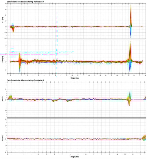 To confirm the hypothesized stability of the ufasomes, further studies were carried out by Turbiscan Lab® Expert by measuring the backscattering and transmission profiles of systems as a function of time (0–1 h) and sample height (mm). Thank to this technique, any kind of possible destabilization phenomena was detected [41]. As shown in Figure 4, ∆t and ∆bs profiles remained in a narrow range during all the analysis time, and in particular the variation of profiles was within values of ±5%, thus indicating that no aggregation, creaming, flocculation or sedimentation phenomena occurred. In fact, Celia et al. [41] affirmed that only a variation of backscattering profiles greater than 10% is indicative for the presence of segregation phenomena. The variation in ∆t and ∆bs profiles that occur below 2 mm and over 8 mm did not depend on destabilization of ufasomes, but it was due to air inclusion in the bottom and/or the top of Turbiscan Lab® vials [30]. These results confirmed the stability of the systems previously provided on the basis of zeta-potential values.
