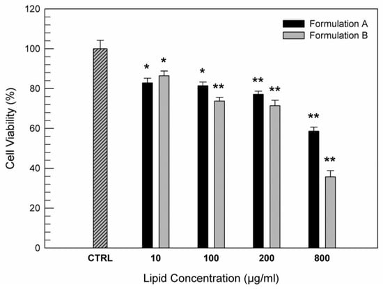 In vitro cytotoxic effects of Formulation A and Formulation B on CaCo-2 cells as a function of lipid concentration (µg/mL). The data are expressed as a percentage of cell viability after 24 h of treatments and they are the average of three different experiments ± standard deviation. * p < 0.05 and ** p < 0.001 versus control (untreated cells).