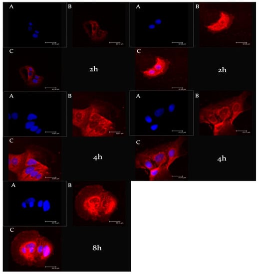 Another fundamental step during the design and the study of new nanosystems was the evaluation of their ability to interact with biological substrates. To evaluate the cell uptake of ufasomes, CaCo-2 cells were treated with rhodaminated formulations A and B (rhodamine-DMPE) for different incubation times (2 and 4 h); and as shown in Figure 6, confocal laser scanning micrographs confirmed the ability of ufasomes to interact with cells and this significant interaction could be correlated with a probable increased pharmacological activity of entrapped oleuropein. In particular, formulation A and B were internalized inside the cytosol already after 2 h of incubation; in fact, significant staining of the cytosol was evident for both formulations. The rapid and effective cellular internalization of ufasomes could be related with the permeation ability of unsaturated fatty acid that can increase the cell membrane fluidity [45].