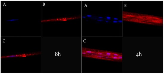 CLSM micrographs of CaCo-2 human colorectal adenocarcinoma cells treated with rhodaminated formulation (A) (left) and (B) (right) as a function of incubation time. (A): Hoechst filter; (B): TRITC filter; and (C): Overlay.