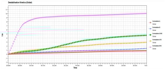 In detail, Figure 6 confirms that formulation A well tolerates the presence of oleuropein at tested concentrations. In fact, stability kinetic profiles of formulation A10 and A100 fell within a narrow range of TSI (Turbiscan Stability Index); on the contrary, the profile of formulation B10 reached high TSI values, supporting the presence of instability phenomena.