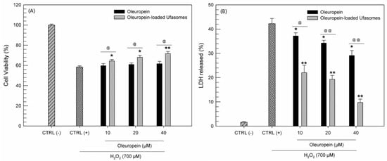 Antioxidant activity evaluation expressed as cell viability (A) and lactic hydrogenase (LDH) released (B). The tests were carried out on CaCo-2 treated with increased oleuropein concentrations, in free form and as active substance loaded ufasomes (Formulation A100), for 24 h and then with H2O2 (700 µM) for 1 h. The results are the average of three independent experiments ± standard deviation. * p < 0.05 and ** p < 0.001 versus H2O2; @ p < 0.05 and @@ p < 0.001 oleuropein-loaded ufasomes versus the same concentration of free oleuropein.