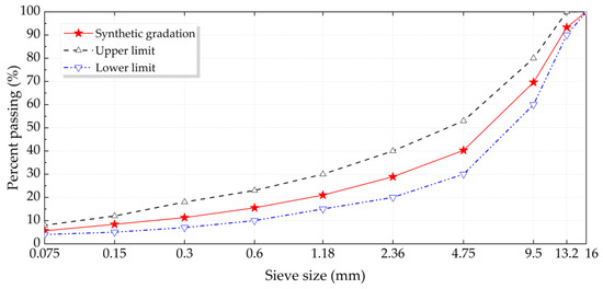 In addition, the coarse aggregate voids-filling method (CAVF) was adopted to design the gradation of bituminous mixtures, including base bitumen and nano-TiO2/CaCO3 modified bitumen, and the gradation curve is illustrated in Figure 1 [42]. According to the specification JTG E20-2011, the optimum asphalt-aggregate ratios of base original bituminous concrete as well as nano-TiO2/CaCO3 modified bituminous concrete were obtained by Marshall design method. Marshall stability, flow, air voids, etc. have been comprehensively considered for different asphalt-aggregate composition from 4.0% to 6.0% with an interval of 0.5% [17,43]. The asphalt-aggregate ratio of base original bituminous concrete as well as nano-TiO2/CaCO3 modified bituminous concrete were determined as 4.9% and 5.3% by the weight of the aggregates, respectively.