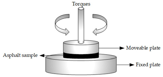The DSR test developed by SHRP is employed to analyze the dynamic characteristics and evaluate the viscoelastic behavior of asphalt materials [44,45,46]. Compared to static experiments (penetration, softening point, etc.), the DSR test has more intuitive and real advantages to assess the properties of bituminous materials. According to the specification ASTM D7175 (AASHTO T31509), the rheological parameters of bituminous materials are determined by Malvern Bohlin Gemini 150 (British Malvern Instruments Ltd.). As shown in Figure 2, by using two parallel plates at the temperature, the DSR test is carried out under constant strain mode at 10 rad/s.