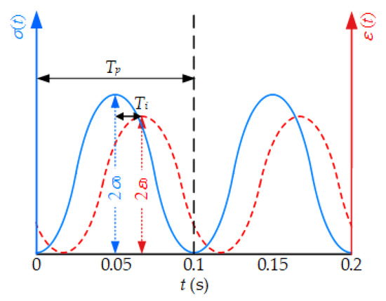 Based on the collected stress and strain data, the complex modulus (E*) can be calculated, which characterizes their relationship subjected to semi-sine load. The complex modulus is related to the corresponding maximum values (2σ0 and 2ε0) of sine wave at a given time (t) and angular frequency (ω), as expressed in the Equation (2). The mechanical response is shown in Figure 4 [50].