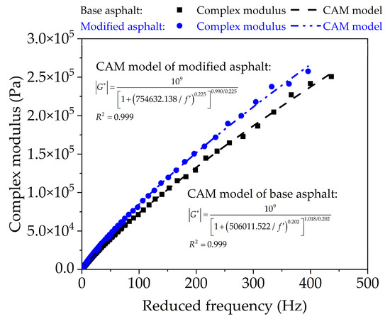 As presented in Figure 6, complex modulus of base bitumen and nano-TiO2/CaCO3 modified bitumen are frequency dependent, and their complex modulus increases with reduced frequency. At the same reduced frequency, the complex modulus of nano-TiO2/CaCO3 modified bitumen is higher. Moreover, the higher the frequency, the more significant their difference. Since the frequency relates to temperature, it also indicates that nano-TiO2/CaCO3 could boost the stabilization capability at higher temperature. In addition, CAM model is able to better fit the complex modulus of base original bitumen and nano-TiO2/CaCO3 modified bitumen with frequency. The fitting parameter m generally represents the sensitivity of bitumen to frequency, and the smaller the value of m, the lower the sensitivity of bitumen to frequency. Thus, the addition of nano-TiO2/CaCO3 reduced the temperature sensitivity of bitumen.
