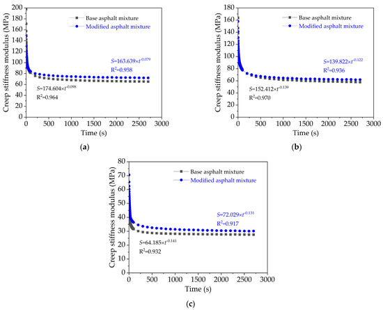 Figure 9. Creep stiffness modulus versus time for base bituminous mixture and nano-TiO2/CaCO3 modified bituminous mixture: (a) 20 °C; (b) 35 °C; and (c) 50 °C.