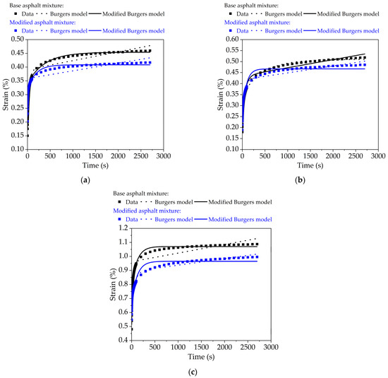 Figure 10. Comparative results of Burgers model and modified Burgers model for bituminous mixtures versus time: (a) 20 °C; (b) 35 °C; and (c) 50 °C.