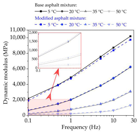 Dynamic mechanical analysis has been used in the past to investigate the viscoelastic properties of bituminous concretes. Dynamic modulus test is one of the most common procedures for determining the dynamic modulus of bituminous mixture [48,49]. In this paper, the dynamic modulus experiment was carried out for three replicate specimens at different experimental conditions, the detailed test program is shown in Table 4 and Table 5.