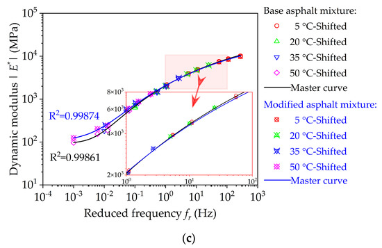 Figure 13. Master curve results of dynamic modulus (reference temperature = 20 °C): (a) base bituminous mixture; (b) nano-TiO2/CaCO3 modified bituminous mixture; and (c) comparative results.