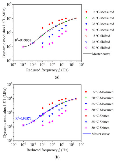 Viscoelastic materials are dependent on time and temperature, that is, increasing temperature and extending time have equivalent effect with decreasing temperature and shortening time for the viscoelastic characteristics, i.e., the principle of time-temperature equivalence. Based on this, the measured dynamic modulus of bituminous mixture in dynamic modulus test at various test conditions can be converted into the values at the reference temperature using the shift factor, thereby forming a smooth master curve of dynamic modulus. Therefore, the viscoelastic behavior of bituminous concretes in a larger temperature and frequency interval would be forecasted according to the master curve of dynamic modulus [48,50].