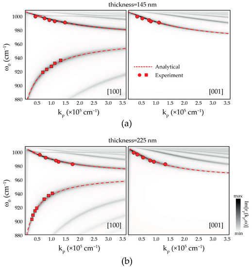 Dispersion of PhPs on thin α-MoO3 flakes on top of SiO2 substrates. Transfer-matrix calculations (false color plot) and analytical polaritonic dispersions (dashed red lines) of PhPs propagating in an α-MoO3 slab with thickness (a) 145 nm and (b) 225 nm, along the [100] (left) and [001] (right) crystal directions of α-MoO3. Red symbols represent the experimental data obtained from monochromatic s-SNOM near-field images.