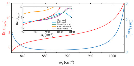 The resulting fitting parameters for the permittivity of SiO2, according to Equation (2), are shown in Table 3 and the calculated IR dielectric permittivity is plotted in Figure 4 together with those reported by Komandin et al. [17], Palik [18], Mamedov et al. [19] and Efimov [20].