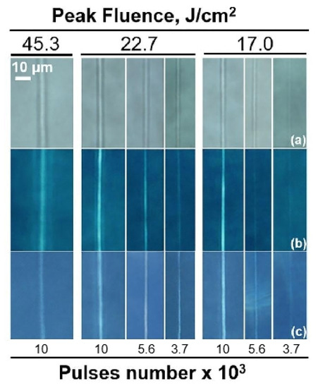 Figure 3. Images of waveguides in transmission light of microscopy (a). Polarized microscopy photos of waveguides in top view before (b) and after (c) heat treatment in a furnace (T = 500 °C, 2 h). The waveguides were fabricated at the peak fluence and number of laser pulses per region, which are indicated in the figure.