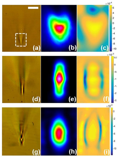 Figure 4. Cross-sectional view of a comet-shaped waveguide (0.6 μJ pulse energy, ~400 pulses) (a), rectangular-sectioned waveguide (0.6 μJ pulse energy, ~104 pulses) (d) and cylindrical-shaped waveguide (1.6 μJ pulse energy, ~600 pulses) (g) with corresponding measured near-field distribution (b,e,h) and estimated refractive index profile (c,f,i). Dash white squares indicate the laser radiation coupling position. Scaling bar equals 10 μm.