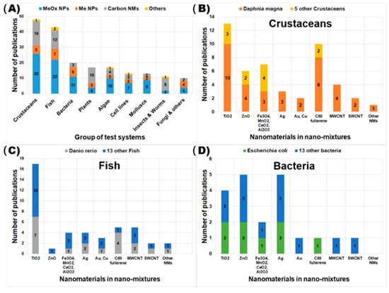 Number of studies on toxicity of nano-mixtures classified by group of test systems (A). Number of studies on toxicity of nano-mixtures classified by nanomaterials in nano-mixtures for crustaceans (B), fish (C), and bacteria (D). (SWCNT: single-walled carbon nanotube, MWCNT: multiple-walled carbon nanotube, NMs: nanomaterials).