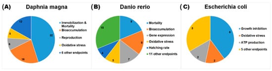 Among the 183 studies, there were 88 different species and 48 different toxicity endpoints for all tested species. The endpoints of the three most popular species (D. magna, D. rerio, and E. coli) are shown in Figure 3. For D. magna, mortality and immobilization were the most abundant endpoints (45%), followed by bioaccumulation (23%), reproduction (8%), and oxidative stress (7%). Other toxicity endpoints (17%) for D. magna were uptake, metal ATPase activity, metallothionein inhibition, retention of dietary, cell damage, and hatching rate. For D. rerio, mortality was the most measured endpoint (19%), followed by bioaccumulation (17%), gene expression (15%), oxidative stress (10%), and hatching rate (8%). Other endpoints (31%) for D. rerio were cell viability, locomotion activity, malformation, abnormality rate, glutathione level, heartbeat, mitochondrial activity, thyroid hormone content, and uptake. For E. coli, growth inhibition was the most measured endpoint (40%). Other endpoints (60%) were oxidative stress, ATP production, photoproduction, indigo degradation, cell wall damage, cell viability, and bioaccumulation.
