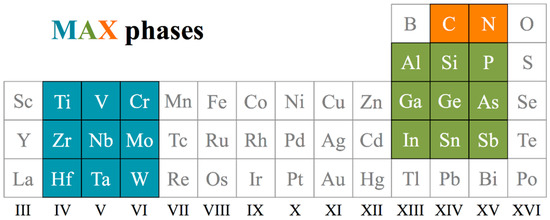 Section of the d- and p-block elements of the periodic table, where elements considered for the presently studied MAX phases and MXene are highlighted in color.