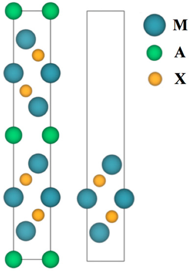 Side views of a MAX crystal cell (left image) and its derived MXene slab cell (right image). Notice the alternate disposition of the two MXene units within the MAX crystal structure. Blue, green, and orange spheres denote M, A, and X elements, respectively.