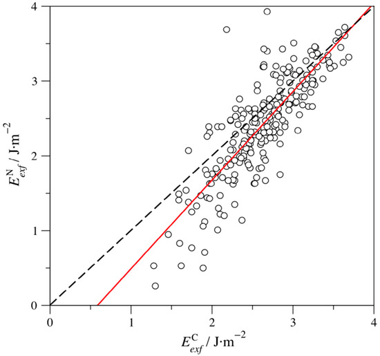 The linear trend of N-based MAX phases exfoliation energies ) with respect to the C-based energies (). The dashed line represents an ideal situation where all . The red line represents the linear adjustment of the values, with a regression coefficient, R, of 0.83, and following the formula .