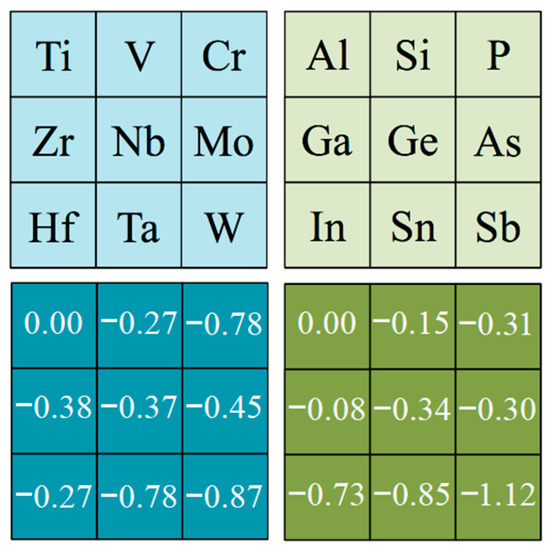 Similarly, the effect of MAX phases being composed by a particular M metal or an A p-block element was investigated. Here, the Ti- and Al-based MAX phases were used as references for evaluating how Eexf values changes by changing the M or A element, respectively—mostly because Ti3C2 MXene was the first-ever isolated, achieved by starting from the Ti3AlC2 MAX phase [1] and normally constituting a reference case for posterior studies. This accounted for, the Mean Deviations (MD) values were acquired for the exfoliation energies, grouped by families of MAX phases. Figure 4 shows the signed deviation according to these families, being nominally zero for Ti-based MAX phases when analyzing the M effect, and zero for Al-based MAX phases when analyzing the A p-block element effect. Thus, analyzing the M effect, one can detect some trend as the exfoliation energies clearly decrease when going along a d series, particularly for 3d and 5d metals, and somehow the Eexf values decrease as well when going down a group, particularly true for group VI metals. At the same time, the analysis reveals that Al-based MAX phases tend to display higher exfoliation energies, and those W-based tend to display the lowest. This is probably due to the particular A-M bond in MAX phases, although a detailed electronic structure analysis is required to confirm this hypothesis. Such analysis is, however, out of the scope of the present study and will be placed in an oncoming study.