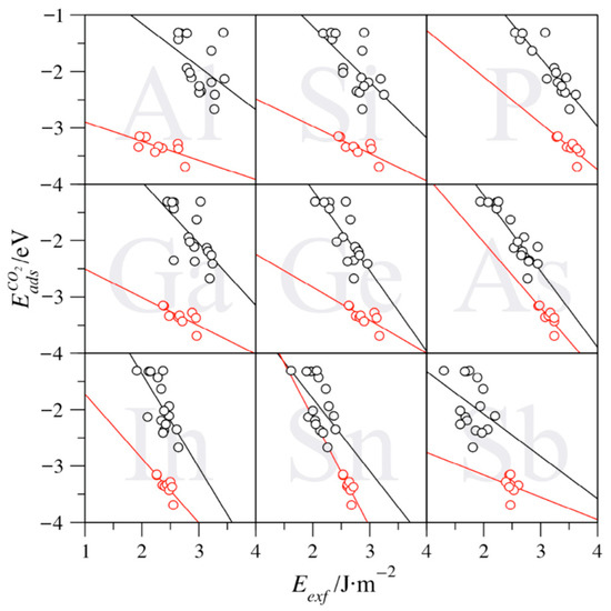 Trends of the CO2 adsorption energy () vs. the exfoliation energy (Eexf) for N-based MXenes. Black spheres denote groups V and VI MXenes altogether, while red ones denote group IV ones. The black and red lines are the linear adjustments of the studied values.