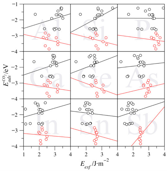 Trends of the CO2 adsorption energy () vs. the exfoliation energy (Eexf) for C-based MXenes. Black circles denote groups V and VI MXenes altogether, while red ones denote group IV ones. The black and red lines are the linear adjustments of the studied values.