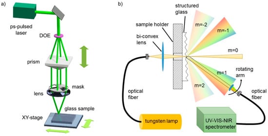 To measure the intensity of the diffracted light by the structured glass samples, the setup shown schematically (top view) in Figure 1b was used. White light emitted by a tungsten lamp is directed to the sample holder by an optical fiber and focused on the sample by a bi-convex lens. Then, the transmitted light in the plane of the movement of the goniometer (angular resolution of 2°) is collected by a plano-convex lens and coupled to an optical fiber, which directs the light toward a UV-vis-NIR spectrometer (OceanOptics GmbH, HR2000+, Ostfildern, Germany). The measured intensities were normalized to the intensity corresponding to the incident light coming from the fiber.