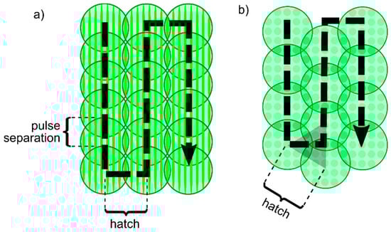 To pattern large areas, the followed strategies are represented in Figure 2. In the case of the two-beam setup, after firing each laser pulse, the stage where the sample is mounted moves vertically a pulse separation distance ps, which can be tuned to deposit different amounts of an accumulated fluence dose (Figure 2a). The ratio between the spot size φ and the pulse separation distance ps yields the effective number of applied pulses on the same area N. When a vertical line is completed, the stage moves sideways along a distance called hatch, which must be a multiple of the used spatial period to avoid destroying the periodic texture.