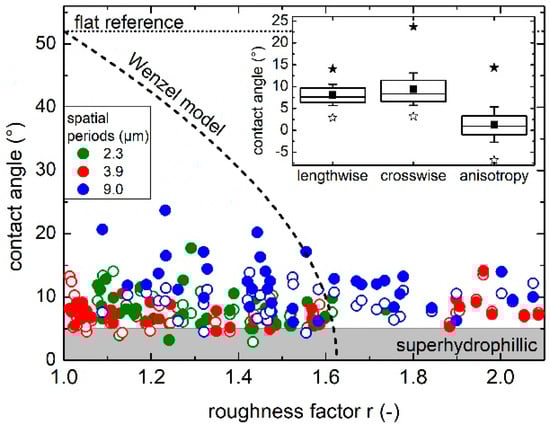 The inset in Figure 5 shows a box chart with the statistical distribution of the CA measured along and across the direction of the grooves (lengthwise and crosswise, respectively) of all structured samples, i.e., 108 patterned fields. The top, middle, and bottom lines of the boxes represent the 75%, 50% (or median), and 25% percentiles, respectively, whereas the filled squares indicate the mean value and the filled (empty) stars are the maximum (minimum) values. Both CAs showed similar mean values and statistical distribution, even though the standard deviation (whiskers) of the crosswise CA was 35% higher than the lengthwise measurement. A measure of the wetting anisotropy is also indicated in the chart, which was calculated as the difference between the lengthwise and crosswise CA. Analyzing this value, it can be observed that the mean value of the CA difference was only 1.3° and, therefore, it can be concluded that, despite the well-defined orientation of the DLIP grooves, the hydrophilic or super-hydrophilic states of the laser-treated samples were mainly isotropic. This behavior can be explained by taking into account the balance between capillary forces, surface tension, and gravity. For the textured glass surface, it can be assumed that the adhesion forces to the rough hydrophilic surface dominate and the droplet spread takes place in all directions regardless of the texture orientation [,,].