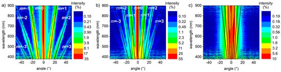 Spectral and angular dependence of the transmitted intensity through three selected structured samples with spatial periods of (a) 2.3 µm, (b) 3.9 µm, and (c) 9.0 µm. The black lines represent the diffraction grating equation for different diffraction orders m.