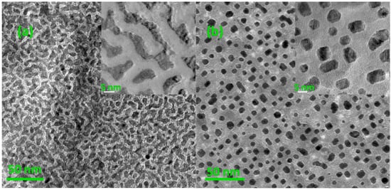 Top-view Transmission Electron Microscopy (TEM) images of (a) S1: before annealing (insert is its local magnification image) and (b) S2: after annealing in oxygen at 800 °C for 4 h (insert is its local magnification image).