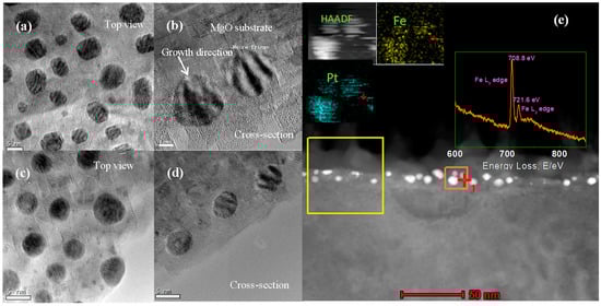 Further, the influence of annealing temperature on particle morphology was also investigated by using TEM. Figure 2 gives the top and cross-section HRTEM images of S2 and S3. It can be seen that the thickness of the MgO cover layer is around 10 nm. The stripe contrast observed in the particles is Moiré pattern caused by the lattice parameter difference between MgO matrix and FePt NPs. The HRTEM images show that the crystal structure of the FePt NPs in both samples remains disordered A1 phase, but their morphology varies with annealing temperature. As shown in Figure 2a,b, the FePt NPs annealed at 800 degrees (S2) exhibit a well-defined morphology with facets. High-resolution TEM observation of FePt NPs (Figure 2b) indicates very good crystalline and a dominant truncated inverted triangle shape. The formation of these shapes may result from the anisotropy of FePt NPs surface energy and the sufficient atoms’ diffusion in higher temperatures [37]. While, as shown in Figure 2c,d, the FePt NPs in S3 exhibit a sphere-like morphology in both top and cross-section view images. Further, the elemental distribution of S2 within the orange area was examined by using EDS mapping, as shown in Figure 2e. It reveals the projected distributions of Pt and Fe within the particle. Figure 2e insert shows the electron energy loss spectroscopy (EELS) spectrum of S2, with its Fe2p3/2 and Fe2p1/2 peaks located at 708.8 and 721.6 eV, respectively. These values are higher than the ones reported for bulk values of pure Fe (Fe (2p3/2) = 706.75 eV, Fe (2p1/2) = 719.95 eV) [38]. It suggests that the Fe atoms of S2 were oxidized after annealing. It also demonstrates that the coverage of MgO cannot avoid the oxidation of Fe when it is exposed to oxygen in high temperatures.