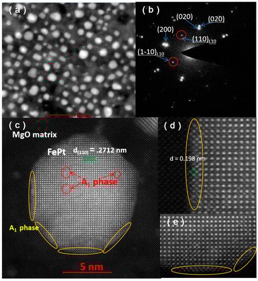 Figure 5a,b shows the STEM image and selected area electron diffraction of S5. S5 exhibits a similar micro-morphology to S2. As shown in Figure 5b, the reflections corresponding to two different compounds are clearly distinguished (FePt reflections are underlined). Beam direction is along the [001] zone axis of the substrate. The orientation relationship between FePt and MgO is < 100 > FePt || <100 > MgO, {001} FePt || {001} MgO. The strong {110} super lattice reflections indicate that FePt NPs with crystallographic c-axis oriented normal to the substrate surface with a high degree of order after annealing in H2/Ar atmosphere. Except for suppressing oxidation, Vladymyrskyi et al. reported that hydrogen plays an important role in the FePt ordering process [25]. The fast diffusion rate of hydrogen atoms in turn could induce an increased diffusion rate of Fe and Pt atoms and thus promote the L10 ordering. Figure 5c shows a HAADF-STEM image of a typical FePt nanoparticle for S5. This particle exhibits fct structure and its (110) d-spacing is around 0.2712 nm. Furthermore, as marked with red circles and yellow circles, a few areas inside and in the edges of the particle present A1 phase. This nano-sized region with disordered feature in the edge may be caused by the tensile strain arising from the lattice misfit between FePt and MgO, while the disorder region inside the particle may be caused by insufficient annealing.