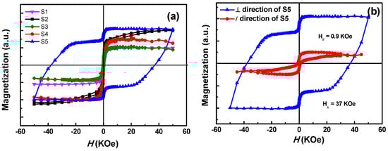 Figure 6a shows the out-of-plane magnetization curves obtained from the samples with different annealing conditions. Except for S5, all the other samples showed a completely soft ferromagnetic behavior, which is for the fcc disordered phase. However, after a heat treatment under H2/Ar atmosphere, the specimen exhibits a big coercivity, which indicates a transition from soft to hard ferromagnetic phase. As shown in Figure 6b, the in-plane and out-of-plane coercivity of S5 were found to be 0.9 and 37 KOe, respectively. The great disparity between in-plane and out-of-plane coercivity indicates that the easy axes of the magnetic grains were perpendicular to the substrate. Moreover, the presence of a shoulder at low applied magnetic field in the hysteresis was caused by the presence of soft phase due to the partial ordered transformation [29,40]. The soft phase resulted from the element segregation and oxidation of Fe, as mentioned from XPS and TEM analyses above.