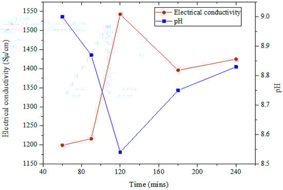 The preparation of stable hybrid nanofluids is a very vital step prior to their characterization and thermophysical property measurement, hence the need to optimize several parameters toward achieving this. The electrical conductivity has been reported as a viable property that can be employed to achieve the critical micelle concentration (CMC) of the surfactant utilized for nanofluid preparation [41,42]. The point of inflection of this property is known to be the CMC. In this study, the optimum ratio of SDS to hybrid nanoparticle weight (dispersion fraction), sonicator amplitude, and sonicating time were determined through the monitoring of the pH and electrical conductivity of MWCNT-Fe2O3/DIW nanofluids (0.1 vol%) at room temperature, as presented in Figure 1 and Figure 2. A turning point (inflection) was observed for the pH and electrical conductivity at an optimum dispersion fraction of 0.5 (Figure 1). Again, the point of inflection was noticed at 120 min for the electrical conductivity in determining the optimum sonication time (Figure 2). The optimum sonication time also indicated a turning point for pH, leading to the optimum (lowest) pH for the MWCNT-Fe2O3/DIW nanofluid. In this present study, the hybrid nanofluids (at all volume concentrations) were prepared by sonicating at an amplitude of 70%, frequency of 70%, and sonication time of 120 min using a dispersion fraction of 0.5.