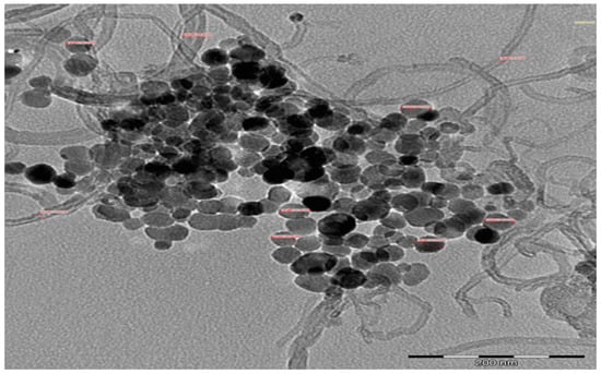 When suspending the bi-nanoparticles in the deionized (DIW) water, a sonicator (Hielscher, Germany) was employed to homogenize the mixture. A programmable water bath (LAUDA ECO RE1225, Berlin, Germany) was deployed to keep the mixture at a low temperature during sonication and used to keep the nanofluids at the specific temperatures while measuring the thermophysical properties. Other pieces of equipment, such as a digital weighing balance (Radwag AS 220.R2 (Radom, Poland) with an accuracy of ±0.01 g), pH meter (Jenway 3510, Staffordshire, UK; –2 to 19.999 range with ±0.003 accuracy), vibro-viscometer (SV-10; A&D, Tokyo, Japan; with ±3% accuracy), UV–visible spectrophotometer (Jenway, Staffordshire, UK), transmission electron microscope (JEOL JEM-2100F, Tokyo, Japan)—dry sample type, and electrical conductivity meter (EUTECH Instrument (Singapore) with ±1% accuracy), were used for various purposes in this work.