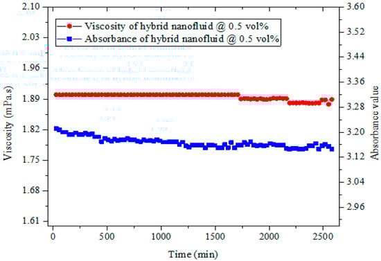 Stability monitoring of 0.5 vol% hybrid nanofluid using viscosity and absorbance.