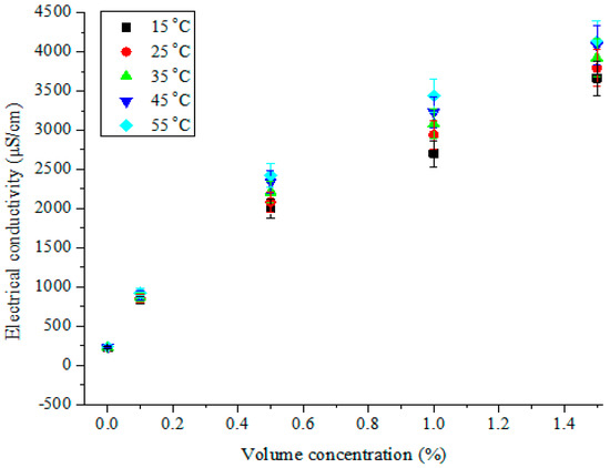 The capability of an aqueous solution to allow the passage of an electric current with the application of a potential difference has been termed “electrical conductivity”. The dispersion of nanoparticles into base fluids (having known electrical conductivity values) to form nanofluids resulted in improved electrical conductivity in the base fluids due to the increased presence and mobility of electric charges. The hybrid nanofluids of MWCNT-Fe2O3/DIW, as electrically conducting fluids, have been investigated for their electrical conductivity at varying temperatures and volume concentrations, as illustrated in Figure 6 and Figure 7, respectively. The electrical conductivity of MWCNT-Fe2O3/DIW nanofluids was enhanced significantly as the volume concentration increased (Figure 6). This can be linked to an increase in the electric charges in the MWCNT-Fe2O3/DIW nanofluids as the volume concentration rose. The electrical conductivity was noticed to be linearly dependent on the volume concentration of the nanofluids. Subject to a temperature increase, a slight enhancement of electrical conductivity was noticed (Figure 6). This observation is well illustrated in Figure 7, in which the electrical conductivity was improved linearly as the temperature increased. Consequently, the electrical conductivity of the nanofluids was directly proportional to the volume concentration and temperature, which was consistent with earlier studies reported in the literature for mono-particle and hybrid nanofluids [14,38,45,46,47,48]. At 55 °C and 1.5 vol%, maximum electrical conductivity (4139 μS/cm) was obtained which was considerably higher than the values of 19.0 μS/cm (for Fe3O4/water nanofluid at 0.6 vol% and 60 °C) and 1127–1265 μS/cm (Al2O3-MWCNT (80:20)/DIW nanofluid at 0.1 vol% and 50 °C) reported by Bagheli et al. [49] and Giwa et al. [38], respectively. However, Giwa et al. [48] published a range of 640–4570 μS/cm for Al2O3-Fe2O3 (75:25)/DIW nanofluid (at 0.75 vol% and 50 °C), which had a maximum value slightly higher than that reported for MWCNT-Fe2O3 (20:80)/DIW nanofluid in the present work. The electrical conductivity values were found to be strongly connected to the types of nanoparticles and the mixture ratios used in formulating the hybrid nanofluids.