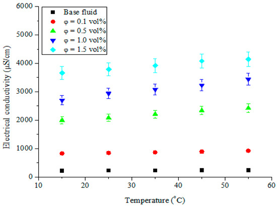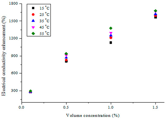 The electrical conductivity enhancement recorded by the addition of the hybrid nanoparticles to DIW at varying temperatures and volume concentrations is provided in Figure 9. In relation to DIW, the electrical conductivity of MWCNT-Fe2O3/DIW nanofluid was augmented significantly as the volume concentration rose but with a small enhancement as the temperature surged. It can be observed in Figure 9 that a relatively linear correlation existed between the enhancement of electrical conductivity and nanofluid volume concentration. A similar trend was noticed for the electrical conductivity enhancement with temperature, though with slight improvement. This result was found to agree with previous works on the electrical conductivity enhancement of nanofluids [44,47,50]. However, some studies reported either independence from temperature in the enhancement or a reduction in electrical conductivity with a temperature increase [43,47,51]. Maximum enhancement was recorded at 55 °C for all samples of the hybrid nanofluids. Therefore, at 55 °C and 1.5 vol%, an enhancement of 1676.4% was attained.