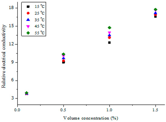 In Figure 8, the relative electrical conductivity of MWCNT-Fe2O3/DIW nanofluids at varying volume concentrations is presented. The continued suspension of Fe2O3 and MWCNT nanoparticles into DIW demonstrated a considerable increase in the relative electrical conductivity, while an increment in temperature slightly enhanced this property. The obtained result was in line with the work of Adio et al. [14], in which the relative electrical conductivity of MgO-EG nanofluids was enhanced with an increase in the nanofluid volume concentration. However, for their study, the temperature only increased relative electrical conductivity up to 30 °C, after which it declined. The obtained relative effective conductivity of MWCNT-Fe2O3/DIW nanofluids ranged from 3.95 to 17.76 for all the concentrations (vol.) at 55 °C.