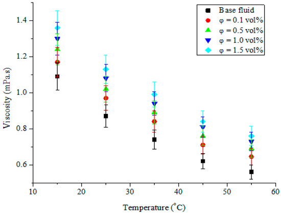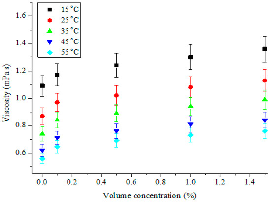 Viscosity of hybrid nanofluids against temperature at different volume concentrations.
