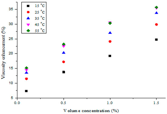 The percentage enhancement of the hybrid nanofluid viscosity compared with DIW under varying temperatures and volume concentrations is illustrated in Figure 13. It can be noticed that a rise in the volume concentration of MWCNT-Fe2O3 (20:80)/DIW nanofluids resulted in substantial viscosity enhancement when compared with DIW. Relatively linear enhancement of the viscosity was noticed for MWCNT-Fe2O3 (20:80)/DIW nanofluids, as the concentration and temperature rose when compared with DIW. For this work, the highest viscosity enhancement of 35.7% was estimated for the hybrid nanofluids compared to DIW. Previous studies have recorded viscosity enhancements of 58% (MWCNT; 1 vol%) [57], 20.5% (Al2O3-TiO2/PAG; 0.1 vol%) [56], 43.52% (MWCNT-CuO/EO; 1 vol%) [58], 46% (Al2O3-MWCNT/EO; 1.0 vol%) [26], 24.56% (Al2O3-MWCNT/DIW; 0.1 vol%) [38], 20% (ZnO-MWCNT/EO; 0.8 vol%) [37], 36.4% (CuO-MgO-TiO2/DIW; 0.5 vol%) [36], and 43.64% (Al2O3-Fe2O3/DIW; 0.75 vol%) [48] for mono-particle and hybrid nanofluids, when compared with the respective base fluids. The results from the present work showed a relatively lower viscosity enhancement in relation to earlier studies, which can be attributed to the types of hybrid nanoparticles and base fluids utilized in preparing MWCNT-Fe2O3 (20:80)/DIW nanofluids. MWCNT nanoparticles are known to have significantly lower density in comparison to metal oxide-based nanoparticles.
