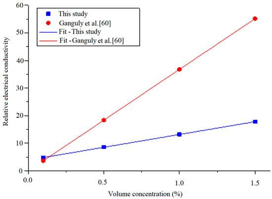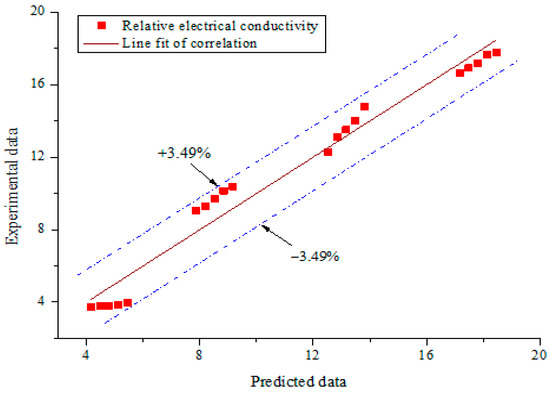 The correlation from the work of Ganguly et al. [60] and that derived using Equation (8) for the relative electrical conductivity of MWCNT-Fe2O3 (20:80)/DIW at 35 °C are plotted in Figure 14. It is obvious that the existing correlation, as published in the literature, overestimated the experimental data of the electrical conductivity of MWCNT-Fe2O3 (20:80)/DIW nanofluid. This was because the existing correlation was formulated using data from a different nanofluid (Al2O3/water) to that utilized (MWCNT-Fe2O3/water) in this study, hence, it could not adequately predict the property. The correlation relating the experimental and predicted data of the relative electrical conductivity of MWCNT-Fe2O3 (20:80)/DIW nanofluid is presented in Figure 15. A straight line was noticed to relate the predicted and experimental values, showing a good correlation between both data sets. The MOD for the correlation was ±3.48%.